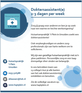 Telefonisch: Van maandag tot en met vrijdag kunt u telefonisch tussen 8.00 uur en 17.00 uur een afspraak maken bij de doktersassistente. Bij het maken van een afspraak zal de assistente vragen naar de reden van het contact. Ze is daartoe opgeleid en doet dat om zo goed mogelijk een inschatting te maken van de aard en spoedeisendheid van uw eventuele klachten. De assistente is (net als de huisarts) verplicht om vertrouwelijk met uw informatie om te gaan.